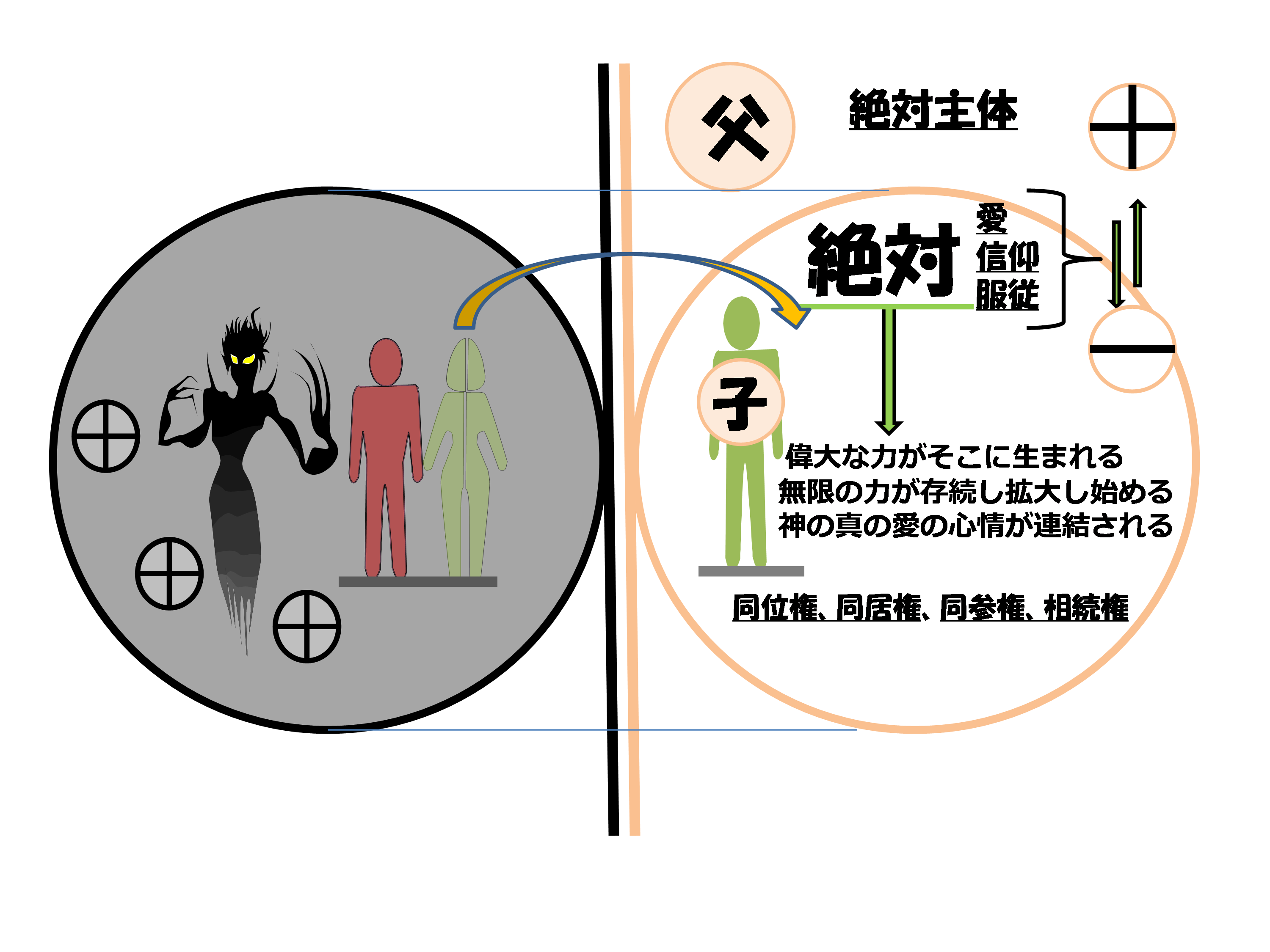 「絶対服従とは、 常に自分の観念がない立場です。存在しているという観念もありません。すべてのものを投入して、忘れるからです。「絶対服従」という言葉の意味の中には、自分の意識がありません。意識がある限り、それは従順です。服従とは、意識がないのです。絶対主体であられる神様の前に完全否定していきなさい、マイナスになりなさい、このような意味の服従です。完全にマイナスになれば、一瞬のうちにプラスにぴたっとくっつくのです。それが天地の道理です」。偉大な力がそこに生まれるのです。絶対投入して忘れることによって、無限の力が存続し始めます。