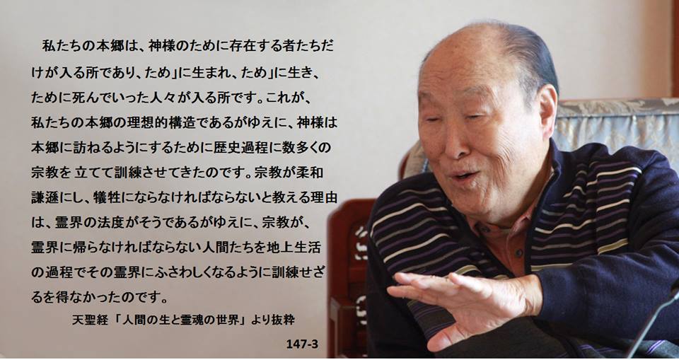 私たちの本郷は、神様のために存在する者たちだけが入る所であり、「ため」に生まれ、「ため」に生き、「ため」に死んでいった人々が入る所です。これが、私たちの本郷の理想的構造であるがゆえに、神様は本郷に訪ねるようにするために歴史過程に数多くの宗教を立てて訓練させてきたのです。宗教が柔和謙遜にし、犠牲にならなければならないと教える理由は、霊界の法度がそうであるがゆえに、宗教が霊界に帰らなければならない人間たちを地上生活の過程でその霊界にふさわしくなるように訓練せざるを得なかったのです。それゆえに、高次的な宗教であるほどより次元の高い犠牲を強調し、奉仕を強調したのです。それは、普段の生活を通してその世界に一致させようというところに、その原因があるのです。