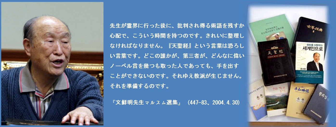 先生が霊界に行った後に批判され得る術語を残すか心配で、こういう時間を持つのです。きれいに整理しなければなりません。『天聖経』という言葉は恐ろしい言葉です。どこの誰かが、第三者が、どんなに偉いノーベル賞を幾つも取った人であっても、手を出すことができないのです。それゆえ教派が生じません。それを準備するのです。