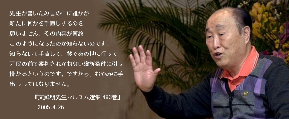 また、先生が書いたみ言の中に誰かが新たに何かを手直しするのを願いません。その内容が何故このようになったのか知らないのです。知らないで手直して、後であの世に行って万民の前で審判されかねない讒訴条件に引っ掛かるというのです。ですから、むやみに手出ししてはなりません。(493-287、2005.4.26)