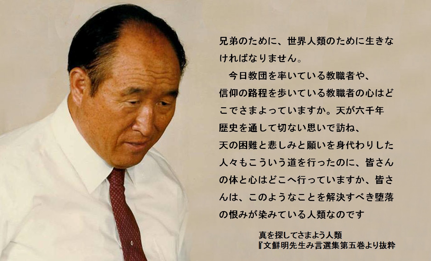 皆さんが待ち焦がれている真の御父母様は、ほんの何十年の間準備して来られるのではありません。その期間は、人間の一生涯でなく六千年でした。そして、来られる時は楽に来られるのではありません。皆さんが楽に寝て休んでいるその時間にも、天は皆さんを探すために骨を折られたというのです。時には乞食の姿で、貧民の姿で、放浪者の姿で、囚人、迫害を受ける者の姿で、悲惨極まりない姿をなさり、人間の一番下の立場から訪ねてこられるのです。