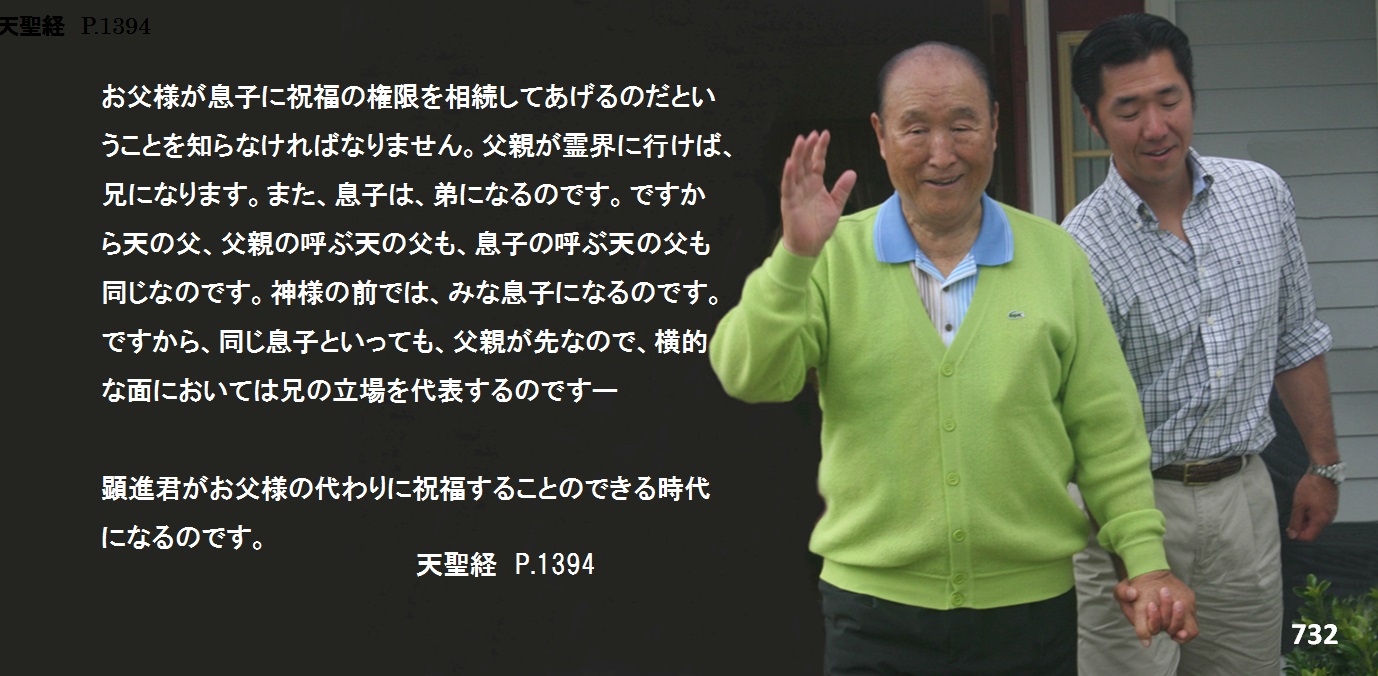 ですから、御父母様が御父母様の立場を完成したということは、息子の立場の完成を、霊界でも地上でも同じ価値的内容を伝授し、一体化させるというようなことをするのです。御父母様が、霊界の長子である興進君を呼んで、このように祝福された家庭を立て、一緒に統一的宣言をすることによって、先生が祝福をしてあげるのではなく、今後は興進君が祝福をするのですが、興進君がいなければ、顕進君がお父様の代わりに祝福することのできる時代になるのです。