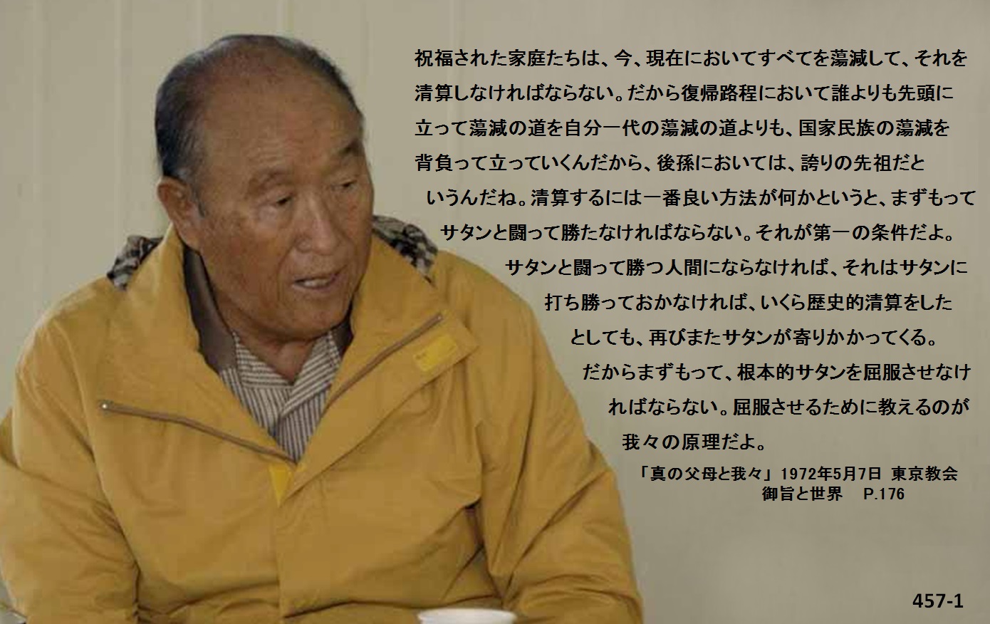 清算するには一番良い方法が何かというと、まずもってサタンと闘って勝たなければならない。それが第一の条件だよ。サタンと闘って勝つ人間にならなければ、それはサタンに打ち勝っておかなければ、いくら歴史的清算をしたとしても、再びまたサタンが寄りかかってくる。だからまずもって、根本的サタンを屈服させなければならない。屈服させるために教えるのが我々の原理だよ。