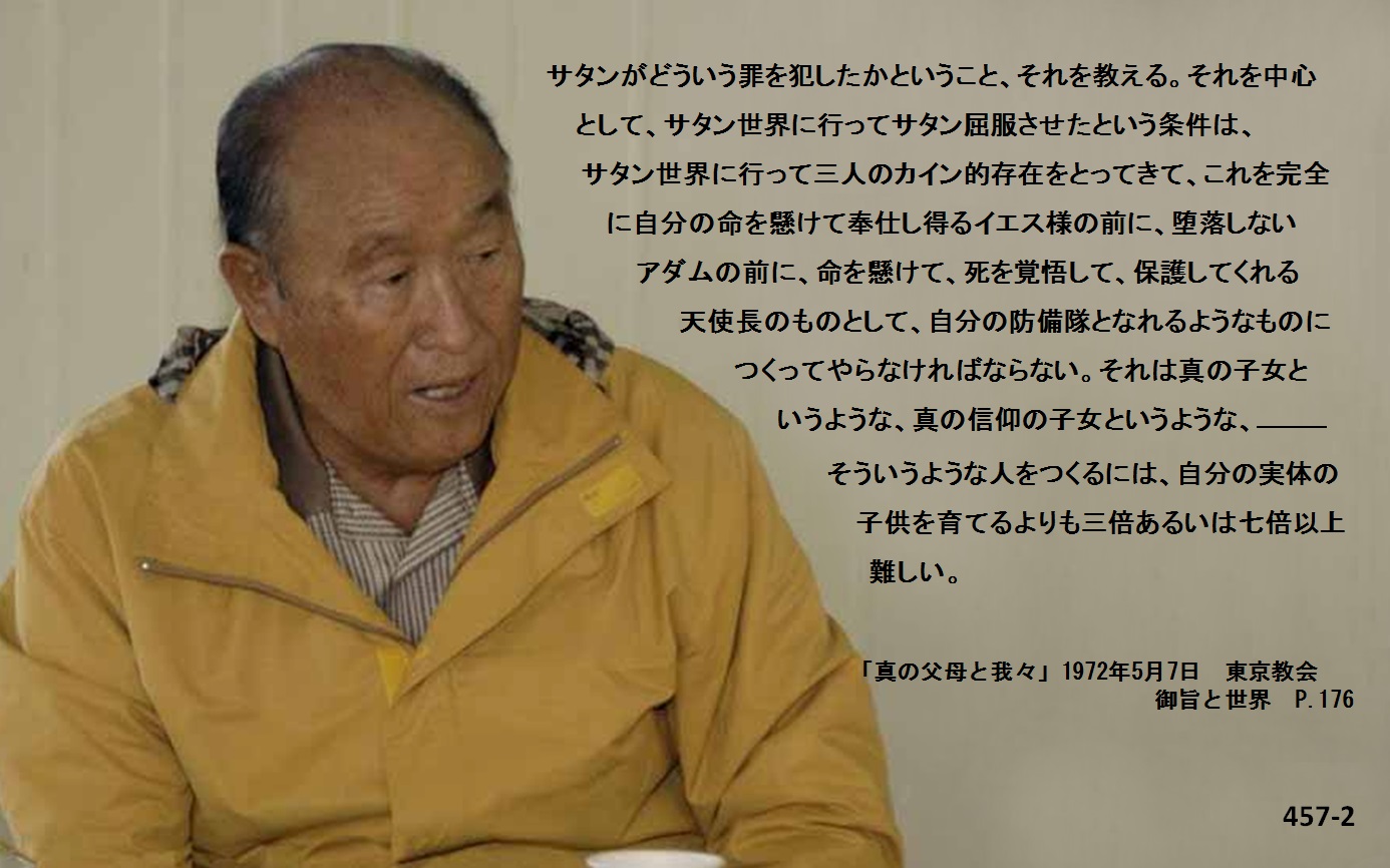 サタンがどういう罪を犯したかということ、それを教える。それを中心として、サタン世界に行ってサタン屈服させたという条件は、サタン世界に行って三人のカイン的存在をとってきて、これを完全に自分の命を懸けて奉仕し得るイエス様の前に、堕落しないアダムの前に、命を懸けて、死を覚悟して、保護してくれる天使長のものとして、自分の防備隊となれるようなものにつくってやらなければならない。それは真の子女というような、真の信仰の子女というような、真のカインというような勝利したカインの立場は何かというと、イエス様を中心として見た場合には、イエス様が十字架につけられるという、そういうような恐ろしい環境ができた場合に、みんな逃げてしまうような者となったらいけません。イエス様を守る。イエス様に先立ち、死を覚悟して立つ。そういう者にならないというと、完全なる勝利し得た三人の天使長として、そういうような人をつくらなければならない。そういうような人をつくるには、自分の実体の子供を育てるよりも三倍あるいは七倍以上難しい。