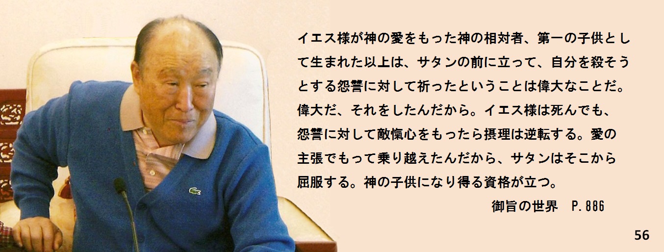 だから、イエス様が神の愛をもった神の相対者、第一の子供として生まれた以上は、サタンの前に立って、自分を殺そうとする怨讐に対して祈ったということは偉大なことだ。偉大だ、それをしたんだから。イエス様は死んでも、怨讐に対して敵愾心をもったら摂理は逆転する。愛の主張でもって乗り越えたんだから、サタンはそこから屈服する。神の子供になり得る資格が立つ。
