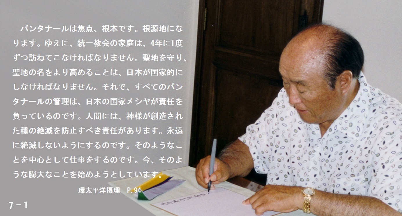 人間は、たとえどれほど苦労をしたとしても、世界から永遠に称賛を受けることができる聖地を準備しておかなければなりません。そうすれば、その努力の結果が現れるのです。ゆえに、その努力を誰が最初に始めるかということが問題です。父から始めるべきですか、母から始めるべきですか。父が立ち上がれば、母の周りを父が回るのですか、それとも父の周りを母が回るのですか。父の周りを母が回るのです。聖地を守り、聖地の名をより高めることは、日本が国家的にしなければなりません。それで、すべてのパンタナールの管理は、日本の国家メシヤが責任を負っているのです。