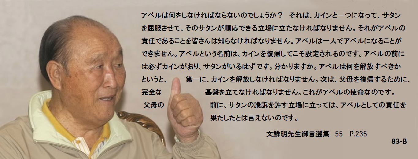 アベルの使命を果たした人は、サタンの讒訴を受ける立場に立ってはいけないのです。アベルは父母を復帰するためにも、中心的な責任を果たさなければなりません。これがアベルの立場です。