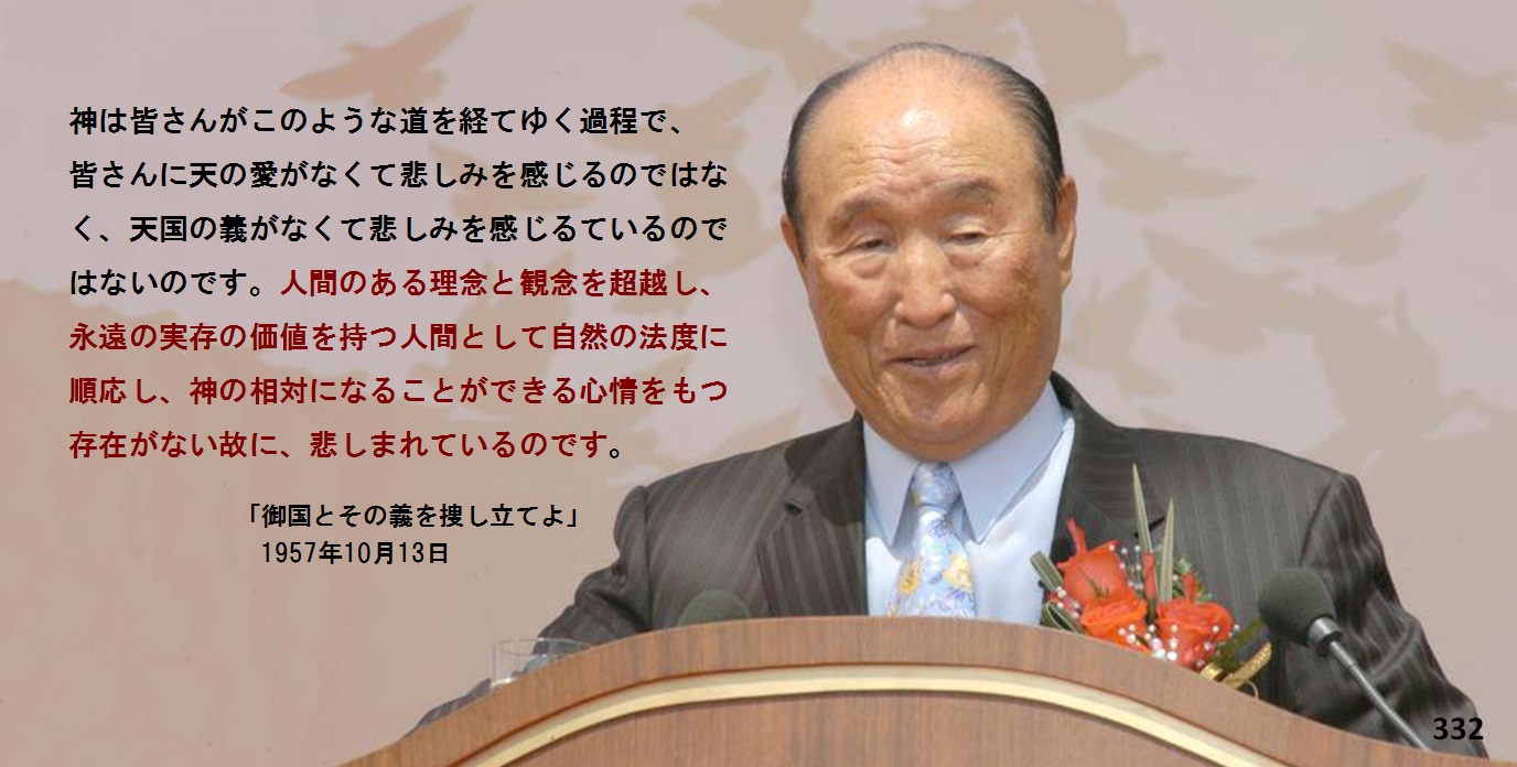 それでは今日、我々の悲しみが何でしょうか。私の悲しみが何でしょうか。キリスト教の悲しみが何でしょうか。また世界の悲しみが何であり、この地上の悲しみが何であり、天の悲しみが何でしょうか。与えようとされるイエス様の愛が、どこに留まっているのでしょうか。我々がこんなすべての問題を未だに解決できないでいることが、天の嘆きであることを皆さんは知らねばなりません。今日この地上の人間を探って見るとき、このような問題を解決できる存在があるかといえば、ないのです。ですから神はこの時間も、切なく嘆息しておられるのです。また皆さんのまえには、これを打開して越えて行くべき歴史的な運命、即ち審判の過程を経て行かなければならない運命が横たわっているのです。神は皆さんがこのような道を経てゆく過程で、皆さんに天の愛がなくて悲しみを感じるのではなく、天国の義がなくて悲しみを感じるているのではないのです。人間のある理念と観念を超越し、永遠の実存の価値を持つ人間として自然の法度に順応し、神の相対になることができる心情をもつ存在がない故に、悲しまれているのです。