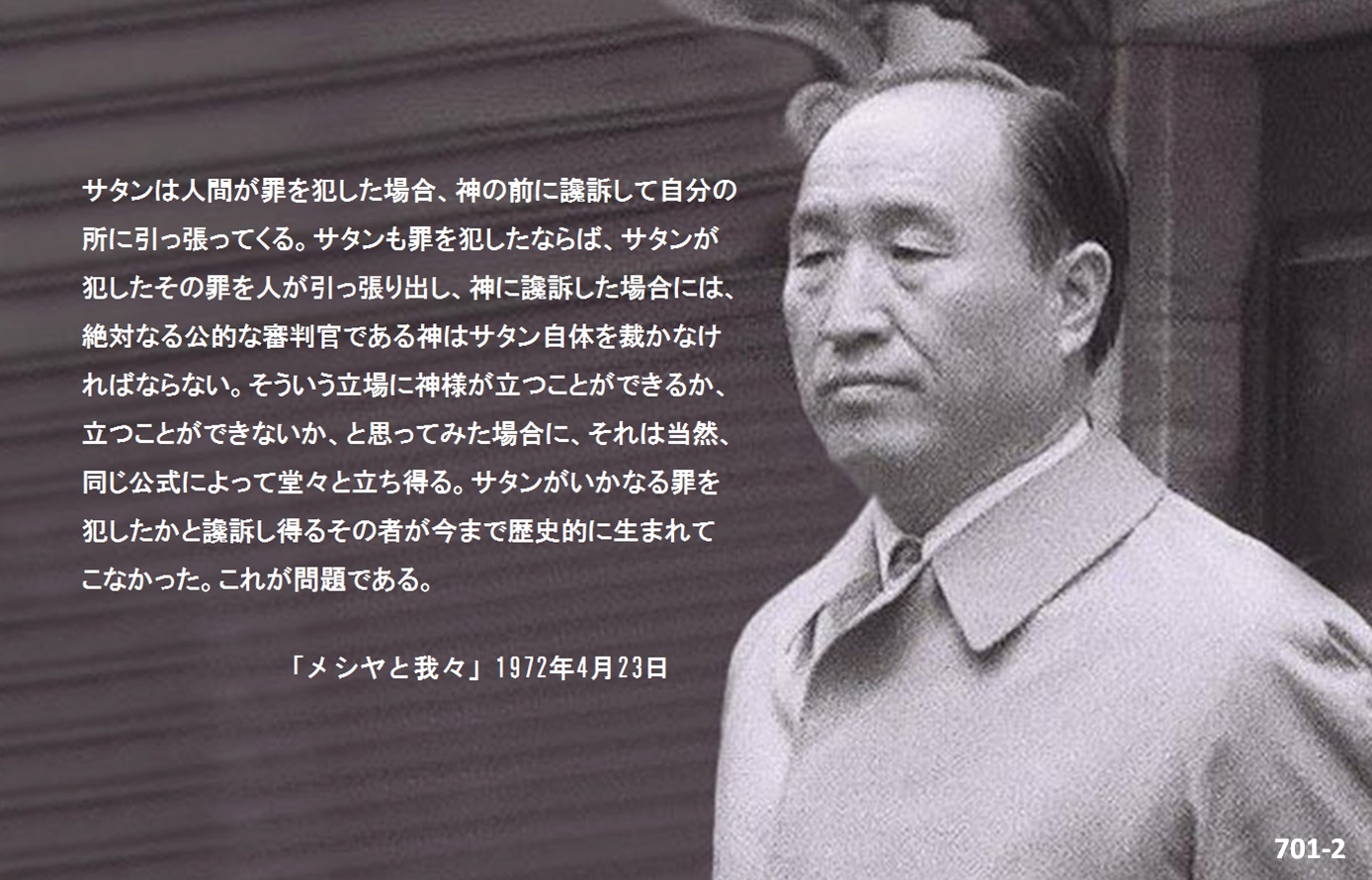 サタンは人間が罪を犯した場合、神の前に讒訴して自分の所に引っ張ってくる。サタンも罪を犯したならば、サタンが犯したその罪を人が引っ張り出し、神に讒訴した場合には、絶対なる公的な審判官である神はサタン自体を裁かなければならない。そういう立場に神様が立つことができるか、立つことができないか、と思ってみた場合に、それは当然、同じ公式によって堂々と立ち得る。サタンがこういう罪を犯したと、讒訴し得るその者が今まで歴史的に生まれてこなかった。これが問題である。
