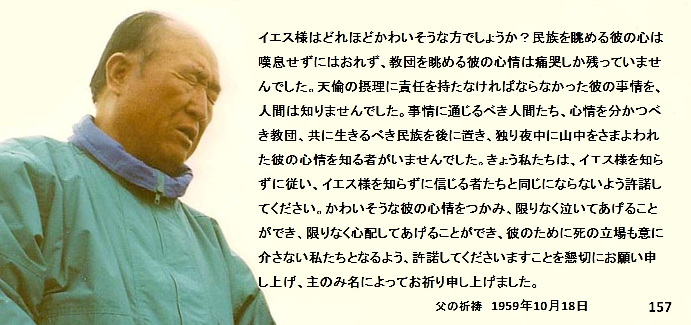 きょうこの時間は、イエス様と歴史的な距離のある時間です。歴史には距離がありますが、心情の世界には距離がないということを知っています。歴史的なイエス様を信じる私たちとならず、心情を通して直接的にイエス様を知り、信じることのできる私たちとならせてください。