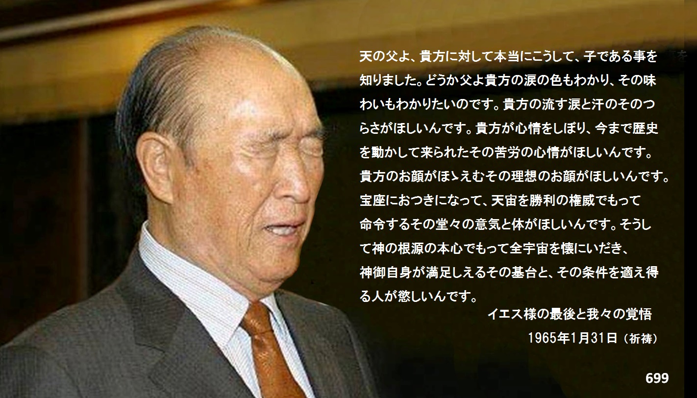 天の父よ、貴方に対して本当にこうして、子である事を知りました。どうか父よ貴方の涙の色もわかり、その味わいもわかりたいのです。貴方の流す涙と汗のそのつらさがほしいんです。貴方が心情をしぼり、今まで歴史を動かして来られたその苦労の心情がほしいんです。貴方のお顔がほゝえむその理想のお顔がほしいんです。宝座におつきになって、天宙を勝利の権威でもって命令するその堂々の意気と体がほしいんです。そうして神の根源の本心でもって全宇宙を懐にいだき、神御自身が満足しえるその基台と、その条件を適え得る人が慾しいんです。