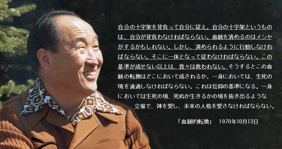 そういう(血統的転換)基準をイエス様は願ってきたのだから、イエス様一身においてそれを成すのに、三年の公生涯に立つ前に宣布したのはなぜかというと、すべての者は誰よりも我を愛せ、妻よりも、親よりも、子供よりも、誰よりも我を愛せ、愛せざるものは自分の弟子にはなれない、ということであった。それから自分の弟子になるには、自分の十字架を背負って自分に従え。自分の十字架というものは、自分が背負わなければならない。血統を清めるのはメシヤがするかもしれない。しかし、清められるように行動しなければならない。そこに一体となって従わなければならない。この基準が成せない以上は、我々は救われない。