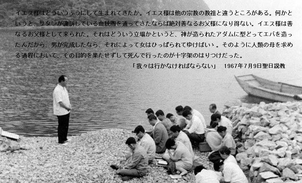 イエス様はどういうふうにして生まれてきたか。イエス様は他の宗教の教祖と違うところがある。何かというと、サタンが讒訴している血統圏を通ってきたならば絶対善なるお父様になり得ない。イエス様は善なるお父様として来られた。それはどういう立場かというと、神が造られたアダムに型どってエバを造ったんだから、男が完成したなら、それによって女はひっぱられてゆけばいゝ。そのように人類の母を求める過程において、その目的を果たせずして死んで行ったのが十字架のはりつけだった。そうなると、世界の万民はどういう結果になったかというと、救いの大もとである善なるお父様が来られたにもかゝわらず、そのお父様を追いやり、十字架にはりつけにして殺してしまった。これらを悟らなければならない。だからいくら、いかに罪深いものであっても自分のお父様であるイエス様を殺したということが本当にわかったときには、悔い改めなければならない。後悔せざるものはない。万民共に、イエス様の本当の立場がわかった時に、涙を流しながら過去に犯した罪を許してもらおうとして悔い改めなければならない。そこにおいて初めて万民はイエス様へ再び繋がることが出来る。そういうふうにして救いの道がある。それを聖書は教えている。