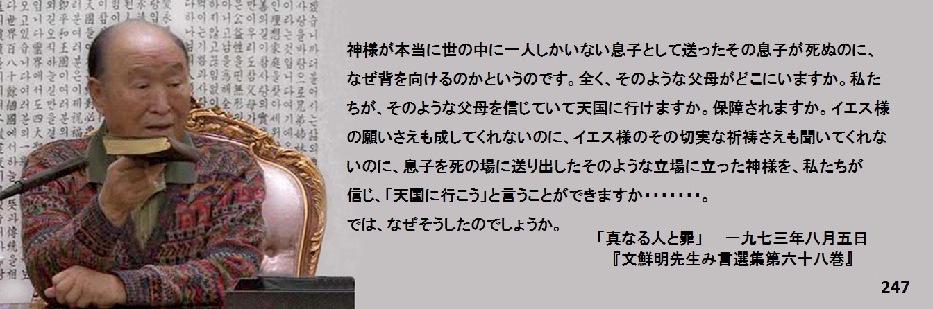 イエス様は「神様の息子だ」と言いましたが、神様はイエス様を愛することができませんでした。十字架にかかって死ぬようになりましたが、なぜ死の場から引っ張り出して保護してあげられる息子になれなかったのでしょうか。これが蕩減路程において、いまだに罪から脱け出すべき運命に立っているために、真なる息子の立場に立てなかったために、彼を解放させられない神様になったというのです。ですから、イエス様が死ぬとき、背を向けなければならなかった事実を、私たちはここから知ることができるのです。