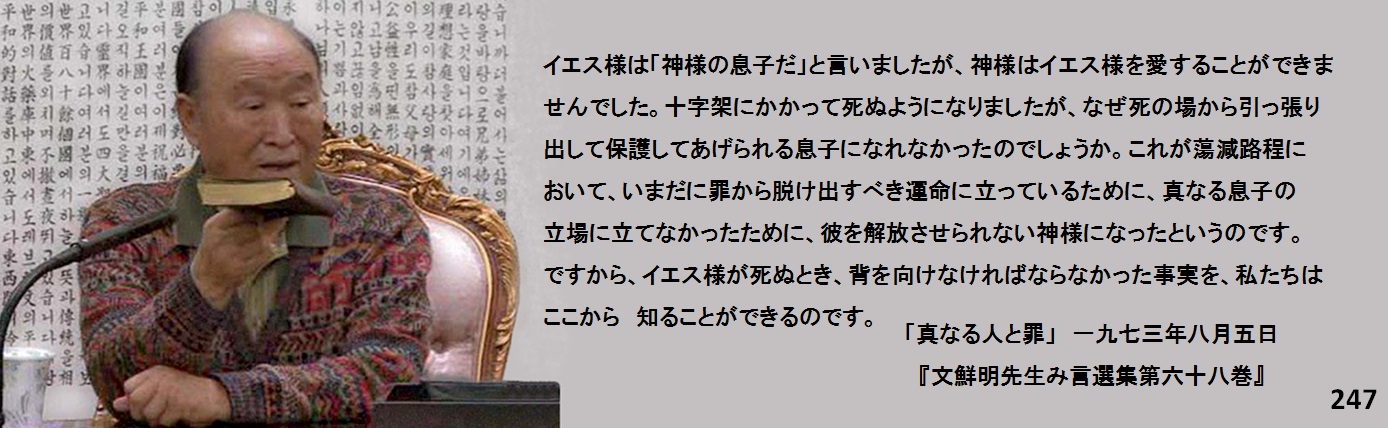 イエス様は「神様の息子だ」と言いましたが、神様はイエス様を愛することができませんでした。十字架にかかって死ぬようになりましたが、なぜ死の場から引っ張り出して保護してあげられる息子になれなかったのでしょうか。これが蕩減路程において、いまだに罪から脱け出すべき運命に立っているために、真なる息子の立場に立てなかったために、彼を解放させられない神様になったというのです。ですから、イエス様が死ぬとき、背を向けなければならなかった事実を、私たちはここから知ることができるのです。