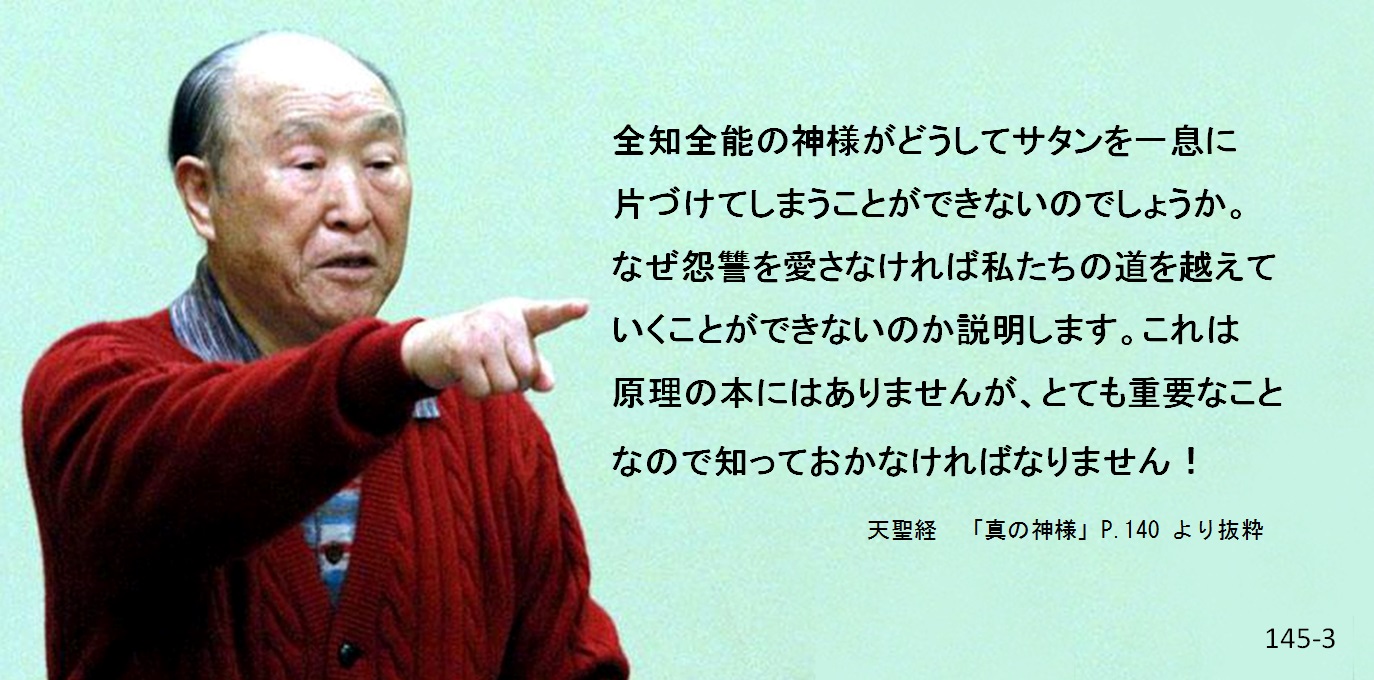 本来サタンは天使長でした。ところがその天使長が「私は堕落してサタンになったが、神様は全知全能の絶対者であるから、あなたの立てた法度を中心として解決しなければならないのではないか。私は法に背いてサタンになったとしても神様は全知全能な絶対者であられるのだから、あなたの設定した法を中心として実践すべきではないのか」と言うのです。