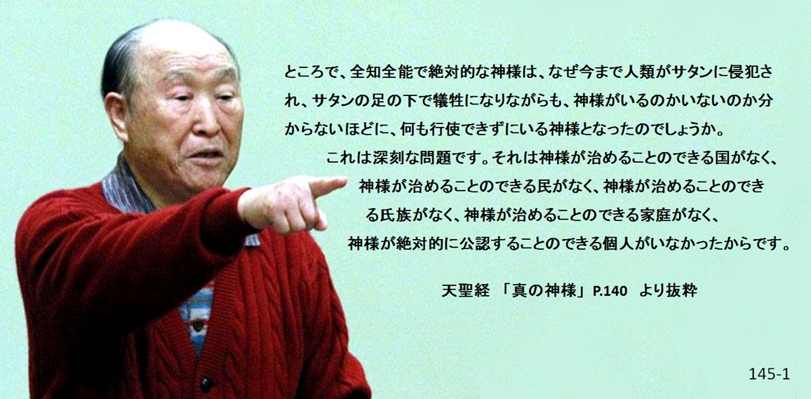 ところで、全知全能で絶対的な神様は、なぜ今まで人類がサタンに侵犯され、サタンの足の下で犠牲になりながらも、神様がいるのかいないのか分からないほどに、何も行使できずにいる神様となったのでしょうか。これは深刻な問題です。それは神様が治めることのできる国がなく、神様が治めることのできる民がなく、神様が治めることのできる氏族がなく、神様が治めることのできる家庭がなく、神様が絶対的に公認することのできる個人がいなかったからです。その個人が成立し、その家庭が成立し、その氏族が成立し、その民族が成立し、その国家主権が成立すれば、一時に悪なる国、悪なる国民、悪なる氏族、悪なる家庭、悪なる個人を処理することができるのです。そうしてこそ善となるのです。そうしてこそ神様の権威が立つのです。