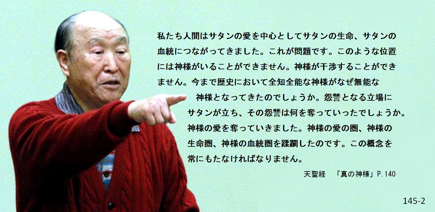 私たち人間はサタンの愛を中心としてサタンの生命、サタンの血統につながってきました。これが問題です。このような位置には神様がいることができません。神様が干渉することができません。今まで歴史において全知全能な神様がなぜ無能な神様となってきたのでしょうか。怨讐となる立場にサタンが立ち、その怨讐は何を奪っていったでしょうか。神様の愛を奪っていきました。