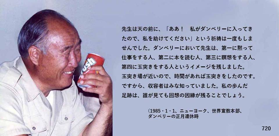 先生は天の前に、「ああ! 私がダンベリーに入ってきたので、私を助けてください」という祈祷は一度もしませんでした。ダンベリーにおいて先生は、第一に黙って仕事をする人、第二に本を読む人、第三に瞑想をする人、第四に玉突きをする人というイメージを残しました。玉突き場が近いので、時間があれば玉突きをしたのです。ですから、収容者はみな知っていました。私の歩んだ足跡は、誰が見ても回想の因縁が残ることでしょう。