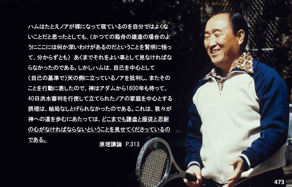 しかしハムは、自己を中心として(自己の基準で)天の側に立っているノアを批判し、またそのことを行動に表したので、神はアダムから一六〇〇年も待って、四〇日洪水審判を行使して立てられたノアの家庭を中心とする摂理は、結局なしとげられなかったのである。これは、我々が神への道を歩むにあたっては、どこまでも謙虚と服従と忍耐の心がなければならないということを見せてくださっているのである。