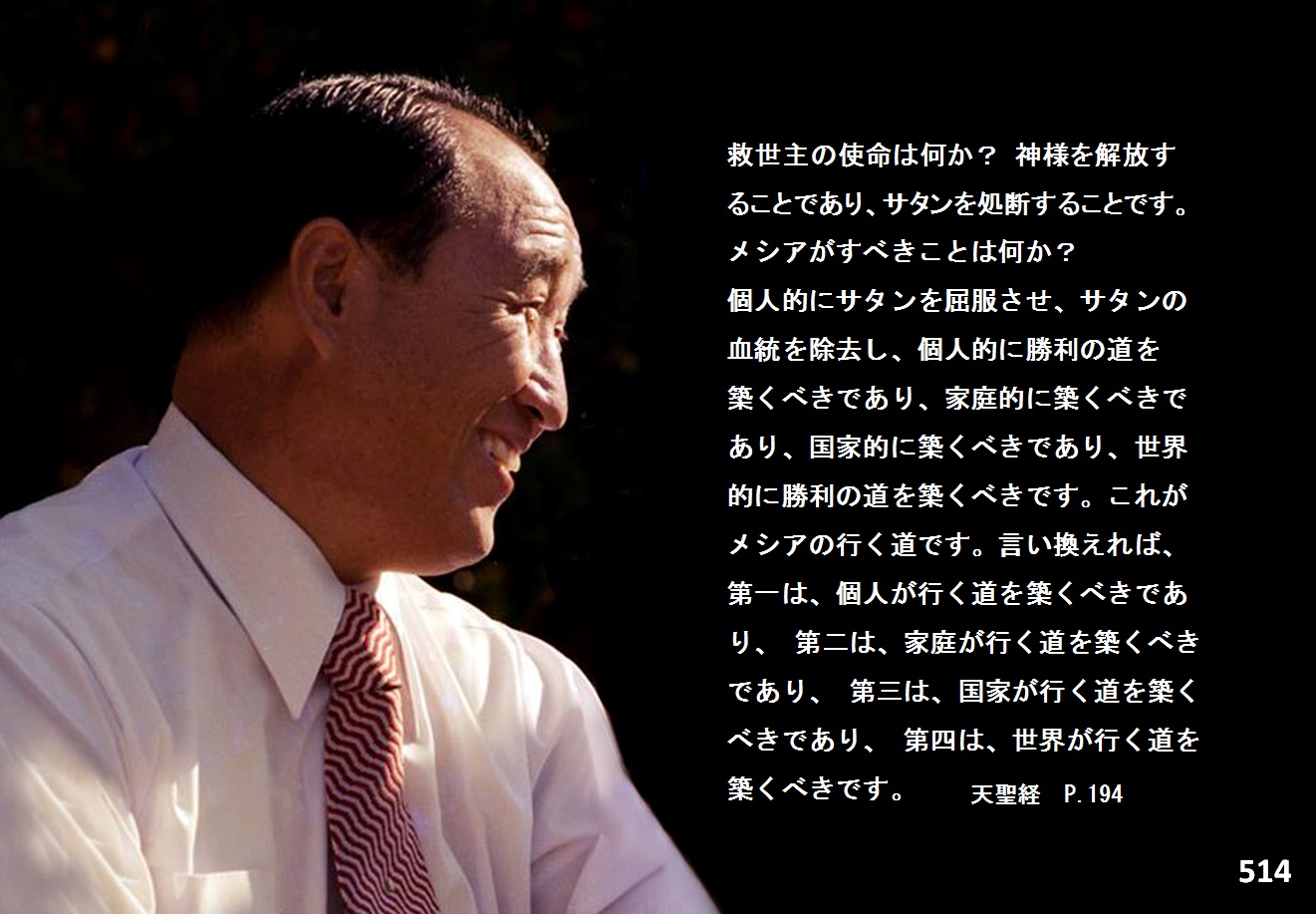 救世主の使命は何か? 神様を解放することであり、サタンを処断することです。そのように人間に食いついて、さっさと処理しながら讒訴していた怨恨の元凶を誰が清算するか? 神様はできません。神様はできないのです。メシヤ、救世主だけができるのです。(一三六・二二〇)