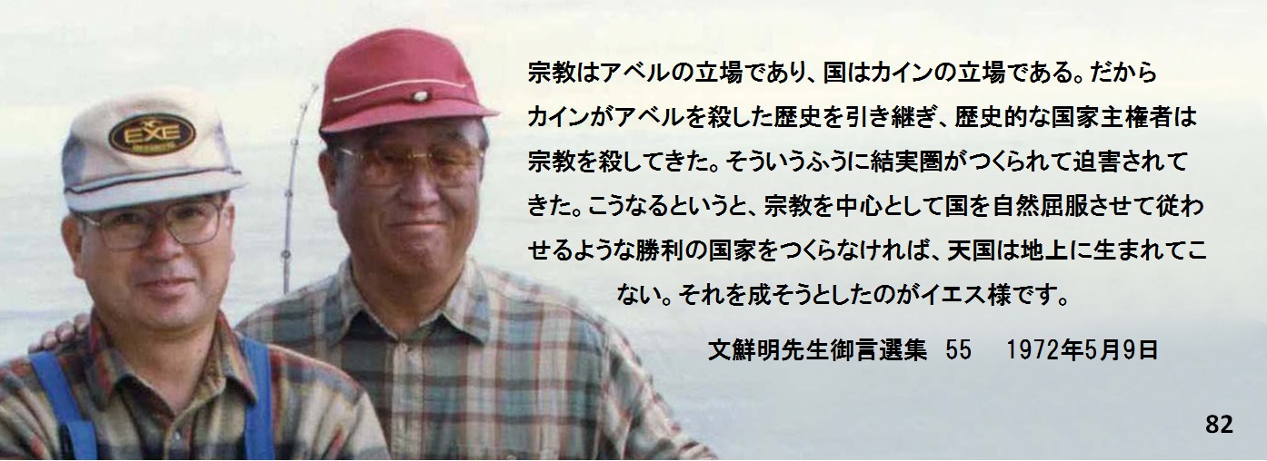 宗教はアベルの立場であり、国はカインの立場である。だからカインがアベルを殺した歴史を引き継ぎ、歴史的な国家主権者は宗教を殺してきた。そういうふうに結実圏がつくられて迫害されてきた。こうなるというと、宗教を中心として国を自然屈服させて従わせるような勝利の国家をつくらなければ、天国は地上に生まれてこない。それを成そうとしたのがイエス様です。