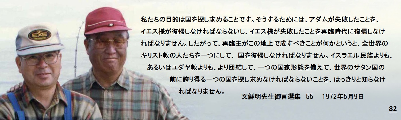 そうするためには、アダムが失敗したことを、イエス様が復帰しなければならないし、イエス様が失敗したことを再臨時代に復帰しなければなりません。したがって、再臨主がこの地上で成すべきことが何かというと、全世界のキリスト教の人たちを一つにして、国を復帰しなければなりません。イスラエル民族よりも、あるいはユダヤ教よりも、より団結して、一つの国家形態を備えて、世界のサタン国家の前に誇り得る一つの国を探し求めなければならないことを、はっきりと知らなければなりません。