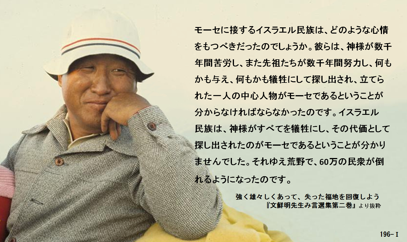 モーセが60万イスラエル民族の代表として立ったと同じように、統一教会において先生もモーセのような使命をもっているのです。モーセ路程を思い起こしてみなさい。