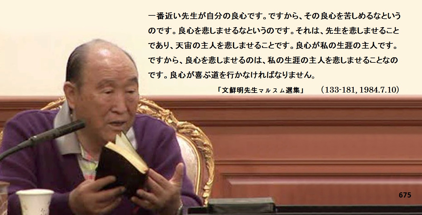 良心を悲しませるなというのです。それは、先生を悲しませることであり、天宙の主人を悲しませることです。良心が私の生涯の主人です。ですから、良心を悲しませるのは、私の生涯の主人を悲しませることなのです。良心が喜ぶ道を行かなければなりません。(133-181, 1984.7.10)