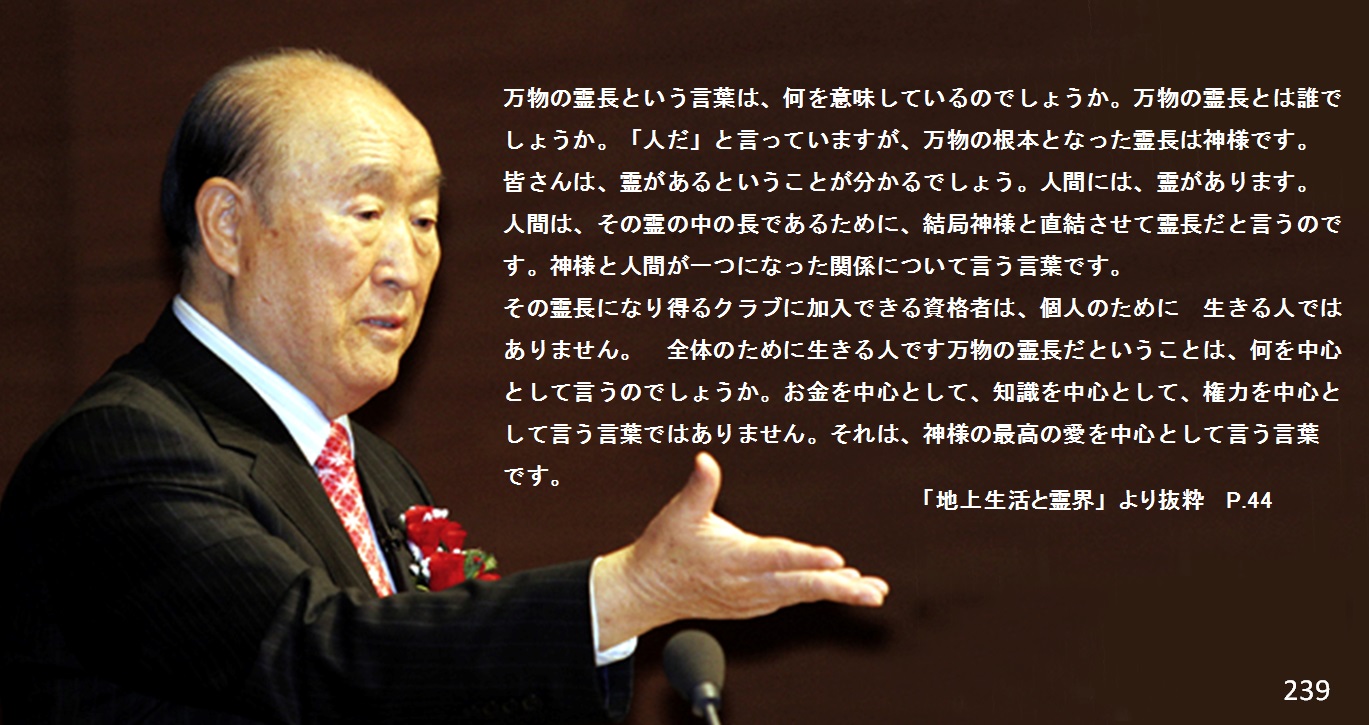 万物の霊長だということは、何を中心として言うのでしょうか。お金を中心として、知識を中心として、権力を中心として言う言葉ではありません。それは、神様の最高の愛を中心として言うことです。