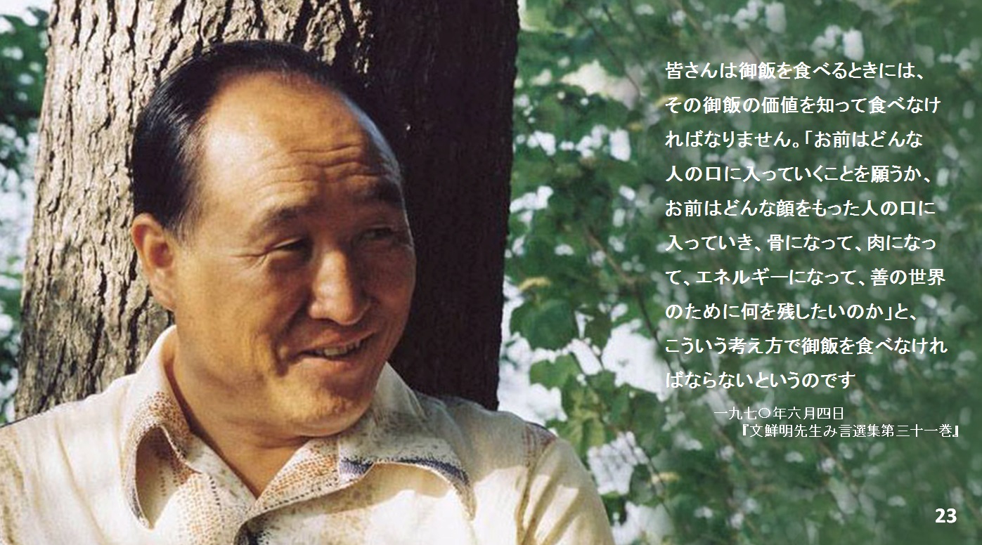 ですから、皆さんは御飯を食べるときには、その御飯の価値を知って食べなければなりません。「お前はどんな人の口に入っていくことを願うか、お前はどんな顔をもった人の口に入っていき、骨になって、肉になって、エネルギーになって、善の世界のために何を残したいのか」と、こういう考え方で御飯を食べなければならないというのです。御飯が悪い人の腹の中に入っていくことを願いますか。たった一粒の御飯粒でも善なる人の腹の中に入っていくことを願うのです。より公的なものを願うというのです