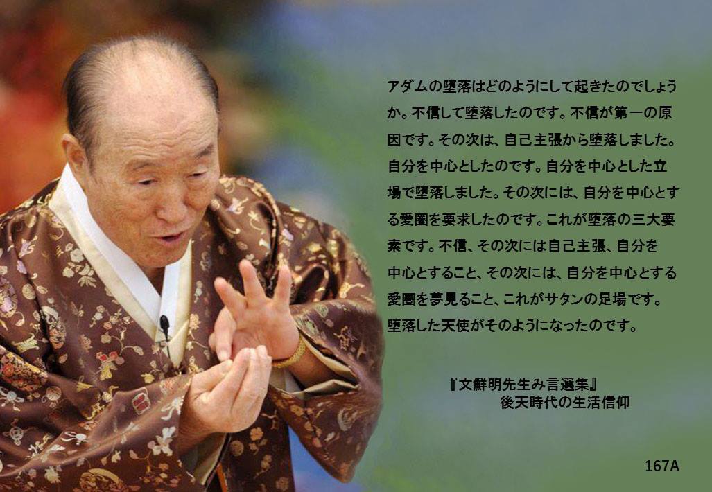 アダムの堕落はどのようにして起きたのでしょうか。不信して堕落したのです。不信が第一の原因です。その次は、自己主張から堕落しました。自分を中心としたのです。自分を中心とした立場で堕落しました。その次には、自分を中心とする愛圏を要求したのです。これが堕落の三大要素です。不信、その次には自己主張、自分を中心とすること、その次には、自分を中心とする愛圏を夢見ること、これがサタンの足場です。堕落した天使がそのようになったのです。