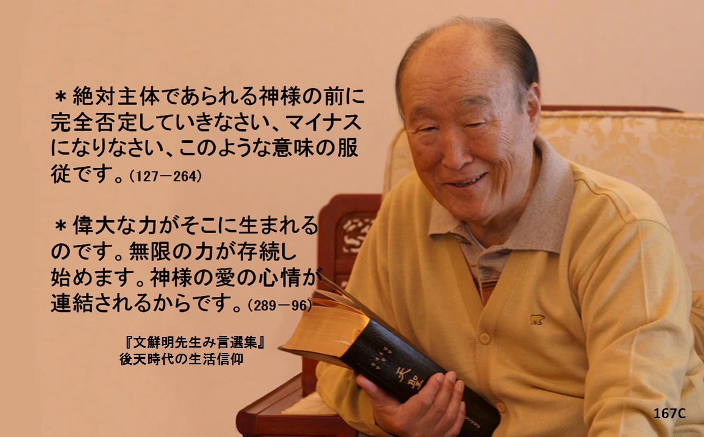 *絶対主体であられる神様の前に完全否定していきなさい、マイナスになりなさい、このような意味の服従です。(127-264)