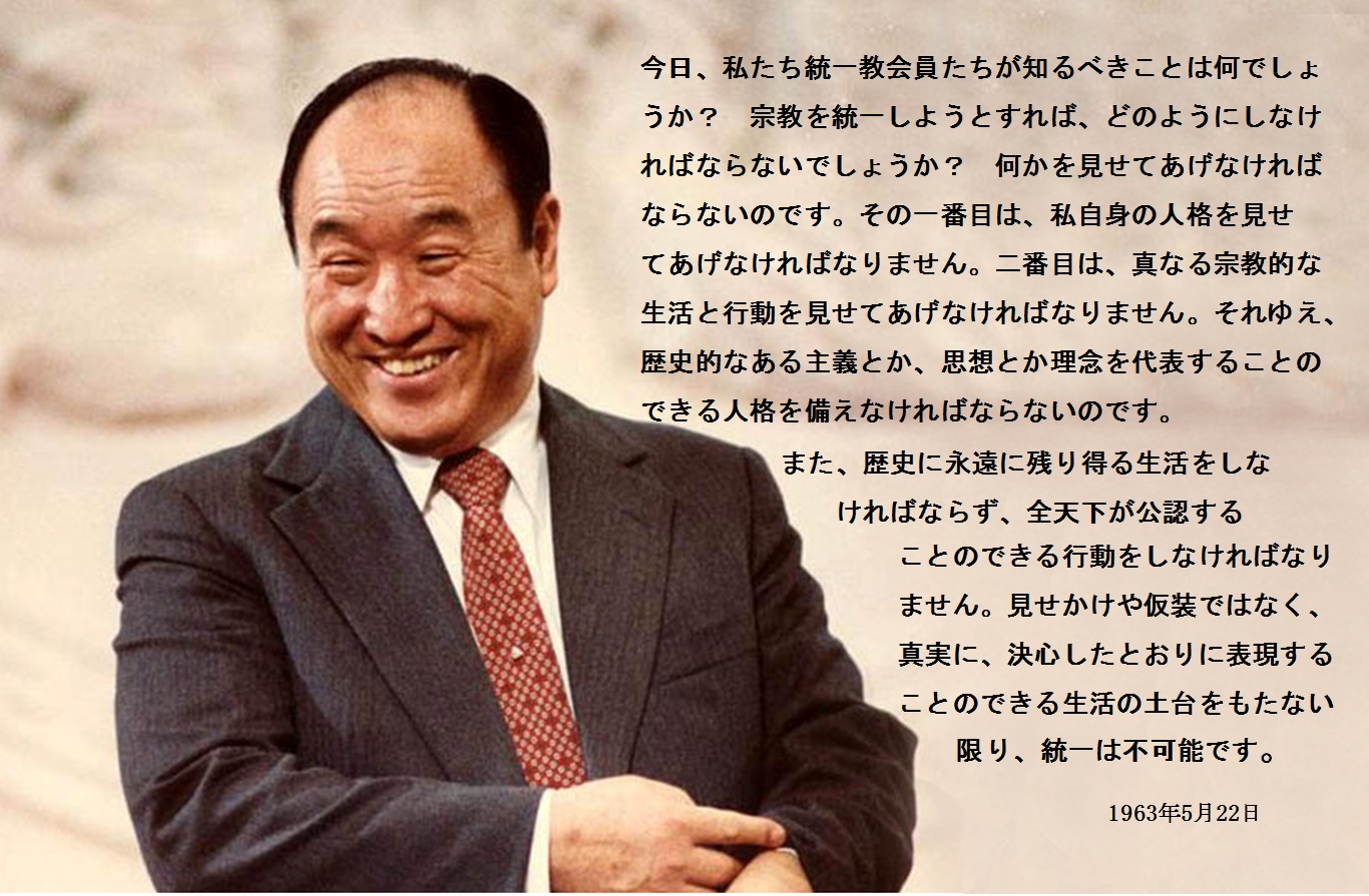 その一番目は、私自身の人格を見せてあげなければなりません。二番目は、真なる宗教的な生活と行動を見せてあげなければなりません。それゆえ、歴史的なある主義とか、思想とか理念を代表することのできる人格を備えなければならないのです。また、歴史に永遠に残り得る生活をしなければならず、全天下が公認することのできる行動をしなければなりません。見せかけや仮装ではなく、真実に、決心したとおりに表現することのできる生活の土台をもたない限り、統一は不可能です。