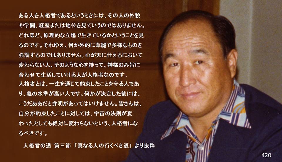 ある人を人格者であるというときには、その人の外貌や学閥、経歴または地位を見ていうのではありません。どれほど、原理的な立場で生きているかということを見るのです。それゆえ、何か外的に華麗で多様なものを強調するのではありません。心が天に仕えるにおいて変わらない人、そのような心を持って、神様のみ旨に合わせて生活していける人が人格者なのです。