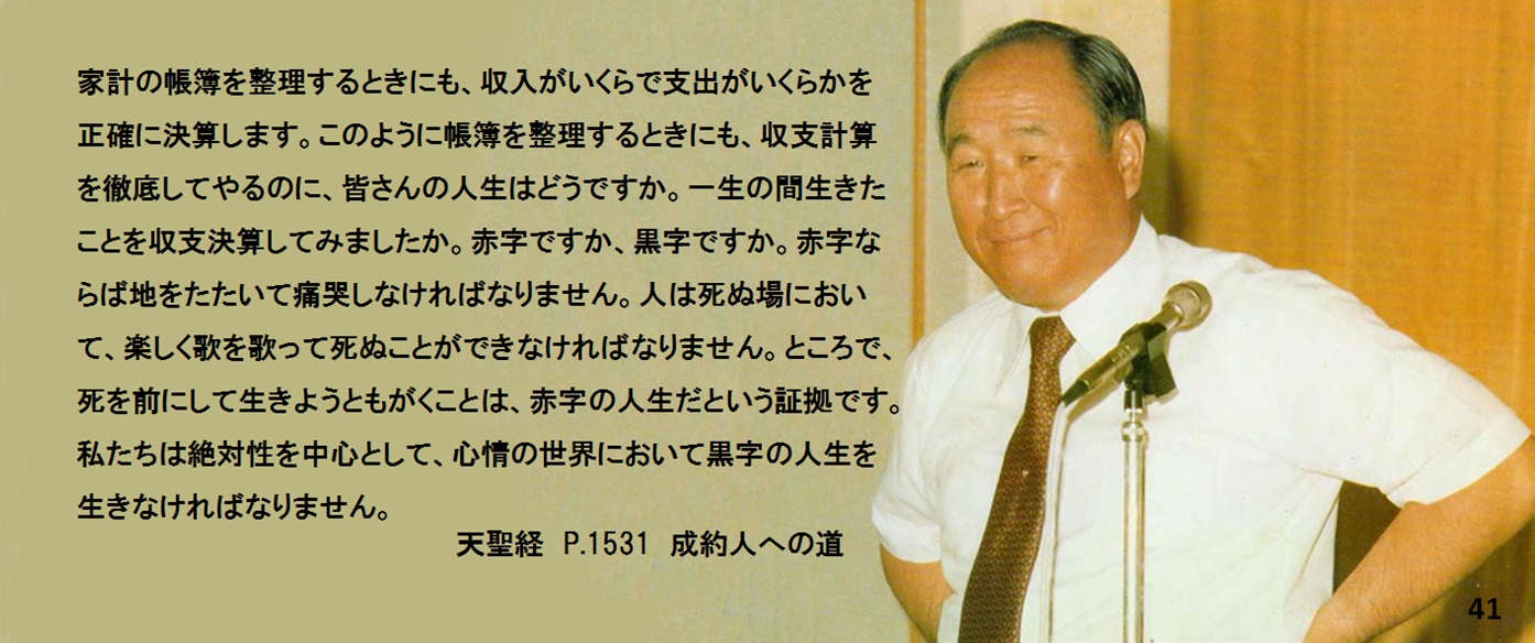 人は死ぬ場において、楽しく歌を歌って死ぬことができなければなりません。ところで、死を前にして生きようともがくことは、赤字の人生だという証拠です。私たちは絶対性を中心として、心情の世界において黒字の人生を生きなければなりません。