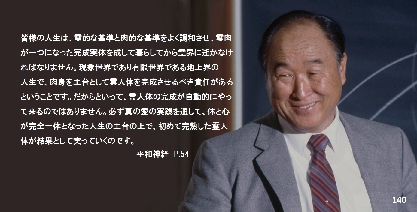 皆様、人間には、体の上位に心があり、心の上位には霊人体があり、その霊人体が入っていって暮らす霊界の上位には、神様がいらっしゃいます。そして、人間は、真の愛を通して神様と完全に一つになるとき、完全な人になるのです。このような観点から、完全な人とは、たとえ小さな個体の姿であったとしても、全体歴史を代表した存在であり、また、未来のすべての因縁を代表した存在なので、天宙的な価値を備えているのです。