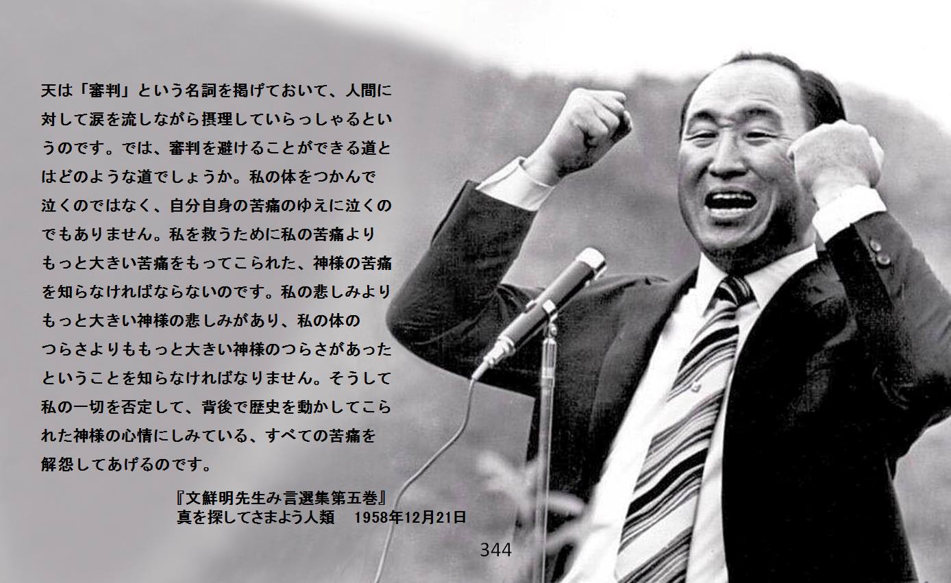 そうして私の一切を否定して、背後で歴史を動かしてこられた神様の心情にしみている、すべての苦痛を解怨してあげるのです。そのようなことに耐えることができる自分を探して、さまよわなければならない運命の中に処しているのが、今日の人類なのです。