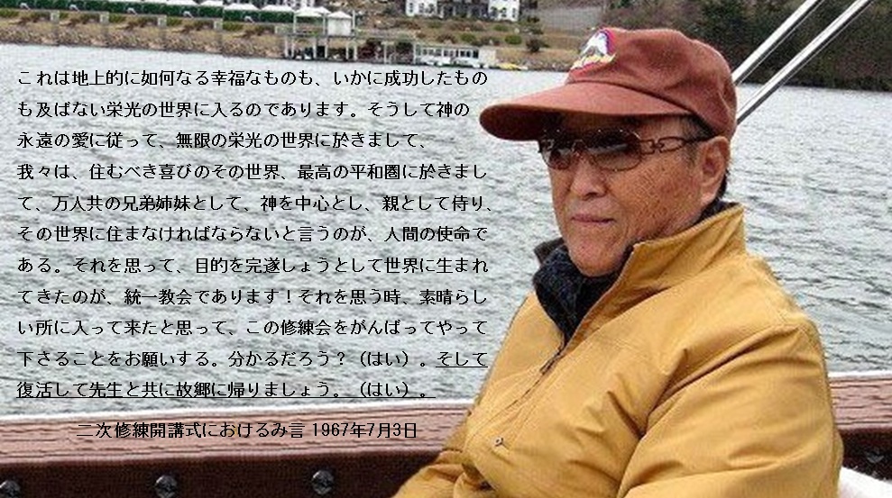 これは地上的に如何なる幸福なものも、いかに成功したものも及ばない栄光の世界に入るのであります。そうして神の永遠の愛に従って、無限の栄光の世界に於きまして、我々は、住むべき喜びのその世界、最高の平和圏に於きまして、万人共の兄弟姉妹として、神を中心とし、親として侍り、その世界に住まなければならないと言うのが、人間の使命である。それを思って、目的を完遂しょうとして世界に生まれてきたのが、統一教会であります!それを思う時、素晴らしい所に入って来たと思って、この修練会をがんばってやって下さることをお願いする。分かるだろう?(はい)。そして復活して先生と共に故郷に帰りましょう。(はい)。