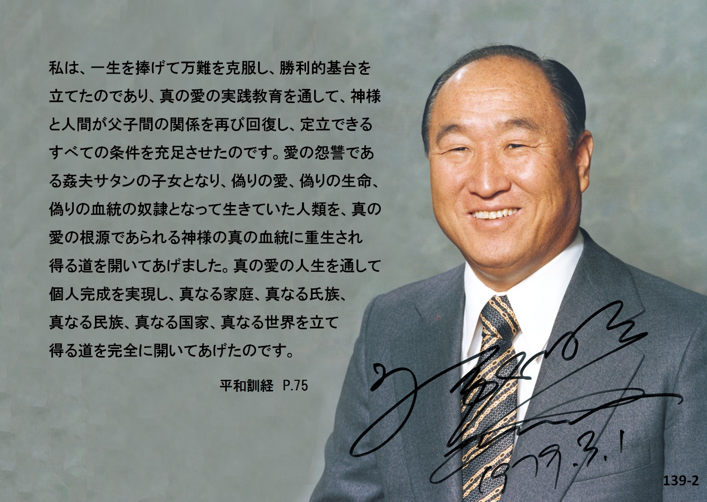 第2に、私は、一生を捧げて万難を克服し、勝利的基台を立てたのであり、真の愛の実践教育を通して、神様と人間が父子間の関係を再び回復し、定立できるすべての条件を充足させたのです。