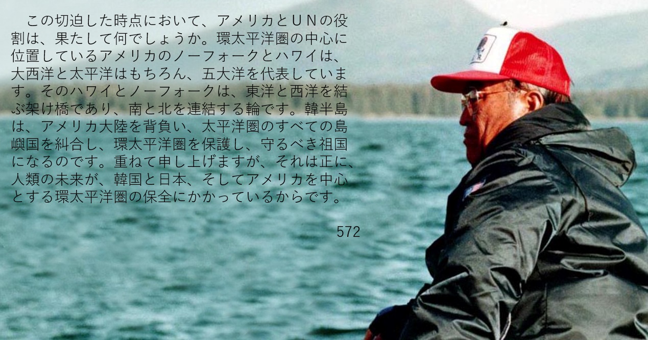 この切迫した時点において、アメリカとUNの役割は、果たして何でしょうか。環太平洋圏の中心に位置しているアメリカのノーフォークとハワイは、大西洋と太平洋はもちろん、五大洋を代表しています。そのハワイとノーフォークは、東洋と西洋を結ぶ架け橋であり、南と北を連結する輪です。韓半島は、アメリカ大陸を背負い、太平洋圏のすべての島嶼国を糾合し、環太平洋圏を保護し、守るべき祖国になるのです。重ねて申し上げますが、それは正に、人類の未来が、韓国と日本、そしてアメリカを中心とする環太平洋圏の保全にかかっているからです。
