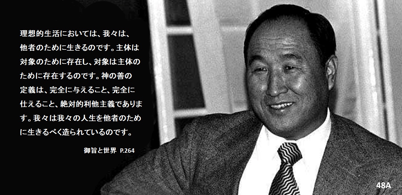 神は宇宙に一つのパターンを敷かれました。理想的生活においては、我々は、他者のために生きるのです。主体は対象のために存在し、対象は主体のために存在するのです。神の善の定義は、完全に与えること、完全に仕えること、絶対的利他主義であります。我々は我々の人生を他者のために生きるべく造られているのです。あなたは他の人のために生き、他の人はあなたのために生きるのです。神は、人間のために生き、人間は神のために生きるのです。夫は妻のために生き、妻は夫のために生きるのであります。これが善であります。そして、ここに初めて統一と、調和と、繁栄とが生まれてくるのであります。