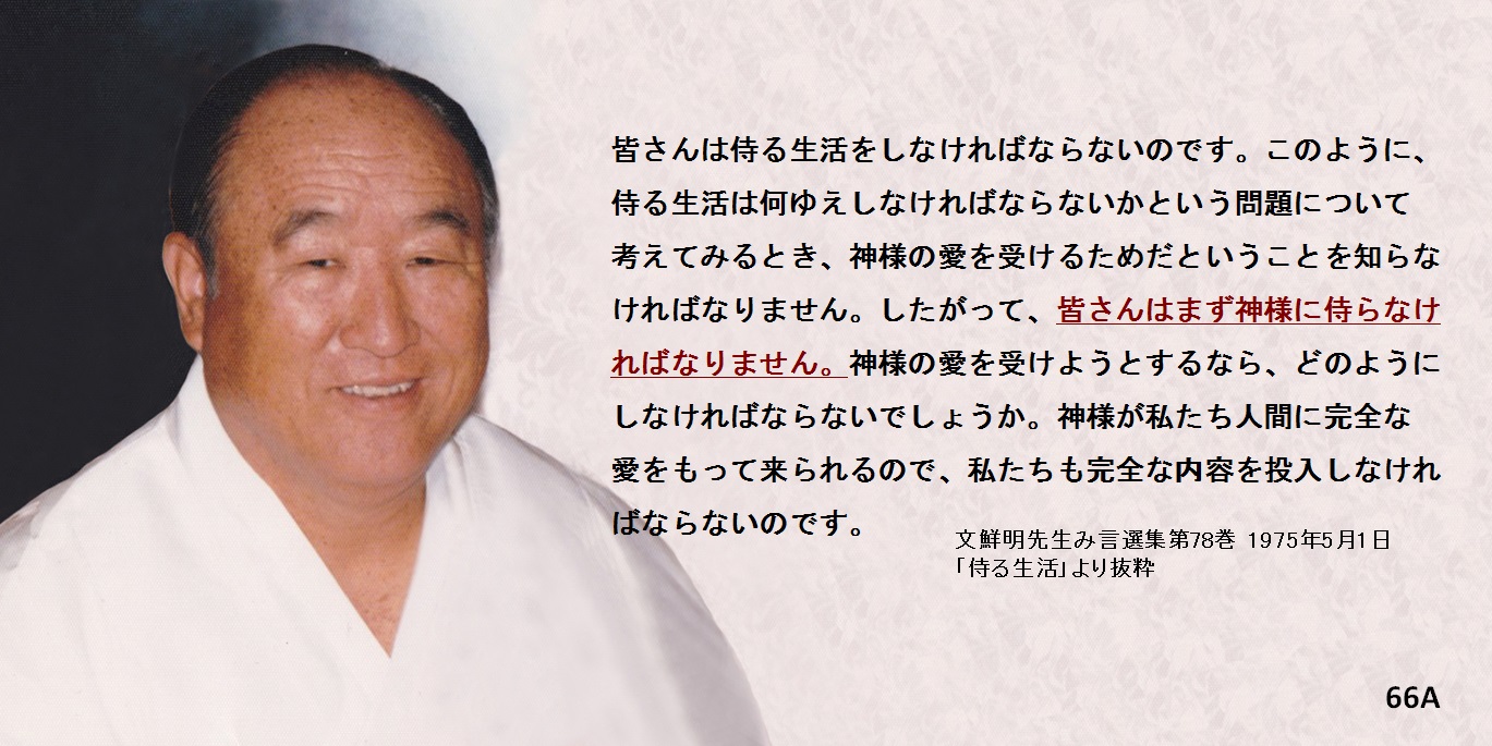 皆さんは侍る生活をしなければならないのです。このように、侍る生活は何ゆえしなければならないかという問題について考えてみるとき、神様の愛を受けるためだということを知らなければなりません。