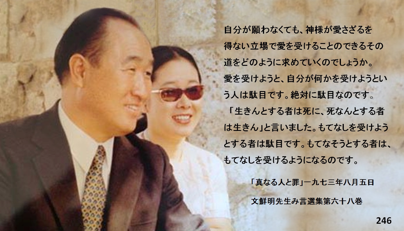 皆さんを愛するにおいて、この道理をどのように経ていくのでしょうか。神様の前に私が愛を受けようといって、神様の愛を受けるのは、愛ではありません。自分が願わなくても、神様が愛さざるを得ない立場で愛を受けることのできるその道をどのように求めていくのでしょうか。愛を受けようと、自分が何かを受けようという人は駄目です。絶対に駄目なのです。