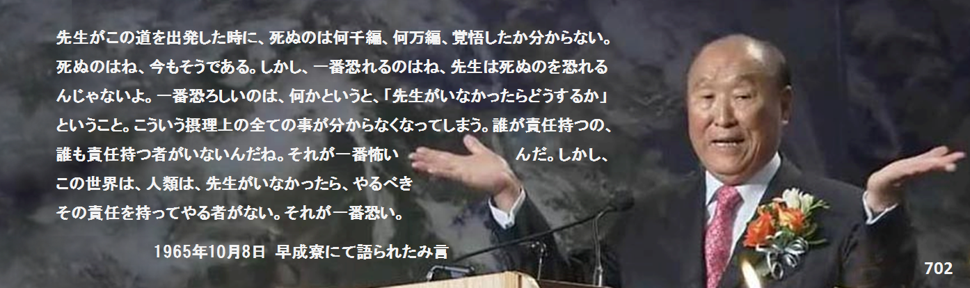 先生がこの道を出発した時に、死ぬのは何千編、何万編、覚悟したか分からない。死ぬのはね、今もそうである。しかし、一番恐れるのはね、先生は死ぬのを恐れるんじゃないよ。一番恐ろしいのは、何かというと、「先生がいなかったらどうするか」ということ。こういう摂理上の全ての事が分からなくなってしまう。誰が責任持つの、誰も責任持つ者がいないんだね。それが一番怖いんだ。そりゃ、霊界の事はよく知っている。今行ってもね、今晩行ってもね、何千年生きてから行く所に行く。それは同じだ。それは決まっている。