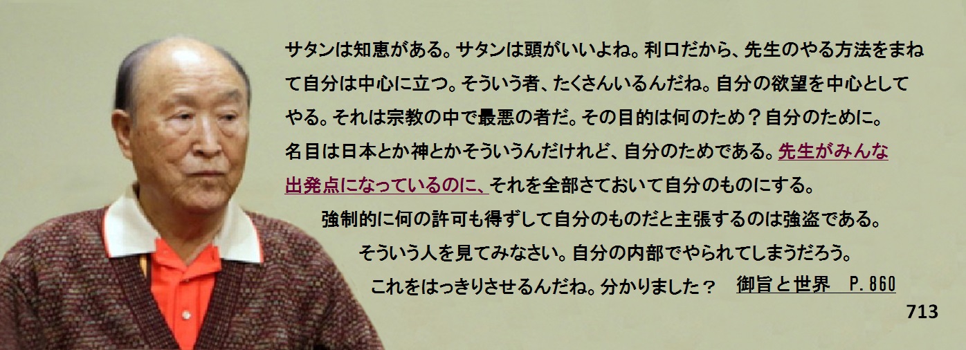 サタンは知恵がある。サタンは頭がいいよね。利口だから、先生のやる方法をまねて自分は中心に立つ。そういう者、たくさんいるんだね。自分の欲望を中心としてやる。それは宗教の中で最悪の者だ。その目的は何のため?自分のために。名目は日本とか神とかそういうんだけれど、自分のためである。