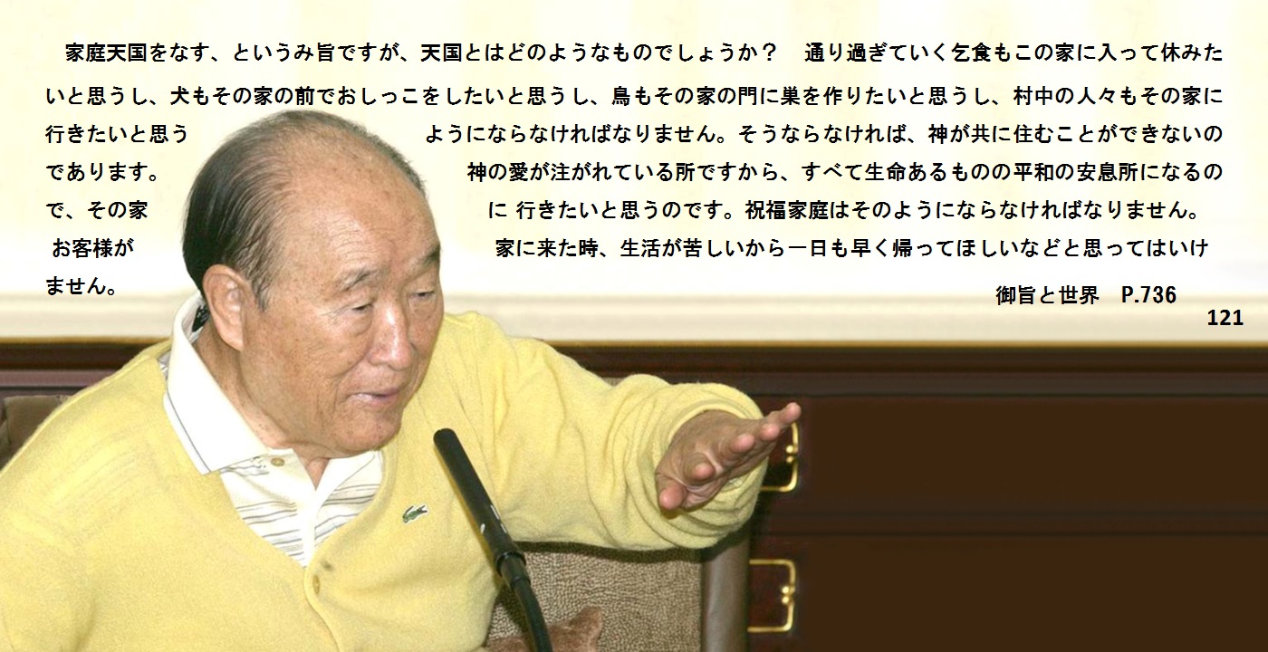 家庭天国をなす、というみ旨ですが、天国とはどのようなものでしょうか? 通り過ぎていく乞食もこの家に入って休みたいと思うし、犬もその家の前でおしっこをしたいと思うし、鳥もその家の門に巣を作りたいと思うし、村中の人々もその家に行きたいと思うようにならなければなりません。そうならなければ、神が共に住むことができないのであります。神の愛が注がれている所ですから、すべて生命あるものの平和の安息所になるので、その家に行きたいと思うのです。祝福家庭はそのようにならなければなりません。お客様が家に来た時、生活が苦しいから一日も早く帰ってほしいなどと思ってはいけませんよ。祝福家庭というのは、お金がない時には自分の洋服を売ってでも、お客様を接待してあげなければなりません。そのような人の未来には、上着が何着も下着までついてくるような恵みがあるのです。