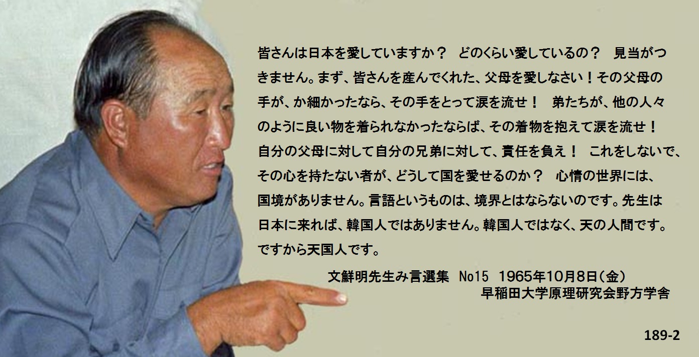 心情の世界には、国境がありません。言語というものは、境界とはならないのです。先生は日本に来れば、韓国人ではありません。韓国人ではなく、天の人間です。ですから天国人です。