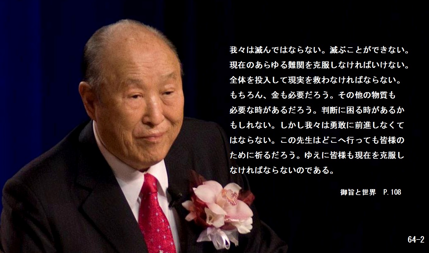 もし、国家が滅んでしまえば、統一教会は行くべき所がない。そういう意味からしてでも、我々はこの国家を固守しなければならない。我々はいたずらに共産主義を恐れてはならない。我々は、我々が既に決意したところを勇敢に実践しなくてはならない。我々は何も持たない裸の立場である。しかし我々は共産主義に勝ることができる。我々統一教会の人たちが国家以上のことをするようになる時には、天が我々を保護するだろう。ここに勝敗の鍵があると私は思うのである。それで我々は勝利を眺めることのできる勇士とならなければならない。
