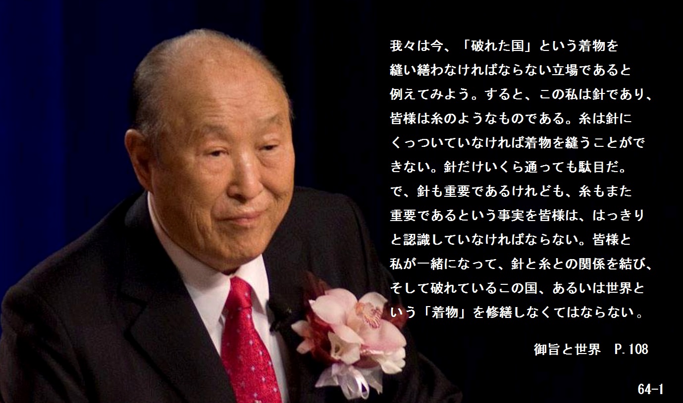 我々は今、「破れた国」という着物を縫い繕わなければならない立場であると例えてみよう。すると、この私は針であり、皆様は糸のようなものである。糸は針にくっついていなければ着物を縫うことができない。針だけいくら通っても駄目だ。で、針も重要であるけれども、糸もまた重要であるという事実を皆様は、はっきりと認識していなければならない。皆様と私が一緒になって、針と糸との関係を結び、そして破れているこの国、あるいは世界という「着物」を修繕しなくてはならない。